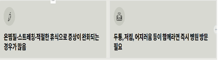 - 온찜질·스트레칭·적절한 휴식으로 증상이 완화되는 경우가 많음