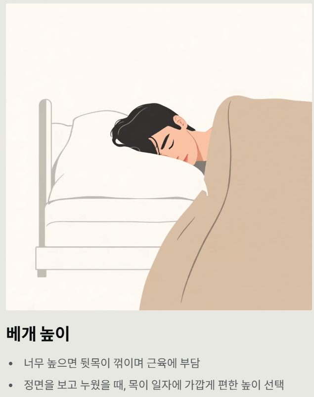 - 정면을 보고 누웠을 때, 목이 일자에 가깝게 편한 높이 선택