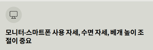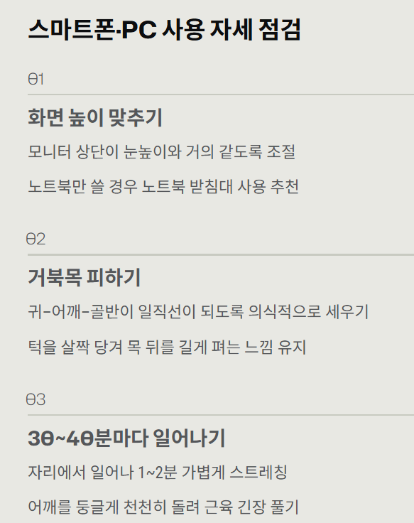 - 모니터·스마트폰 사용 자세, 수면 자세, 베개 높이 조절이 중요