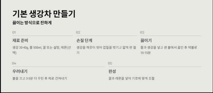 요약: 생강을 얇게 썰어 10~15분 끓여 꿀·레몬과 함께 마시면 기본 생강차 완성입니다.