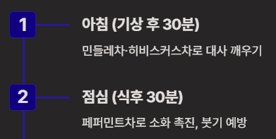 | 옥수수수염차 | 수분 대사 개선, 부종 완화 | 오후~저녁 |